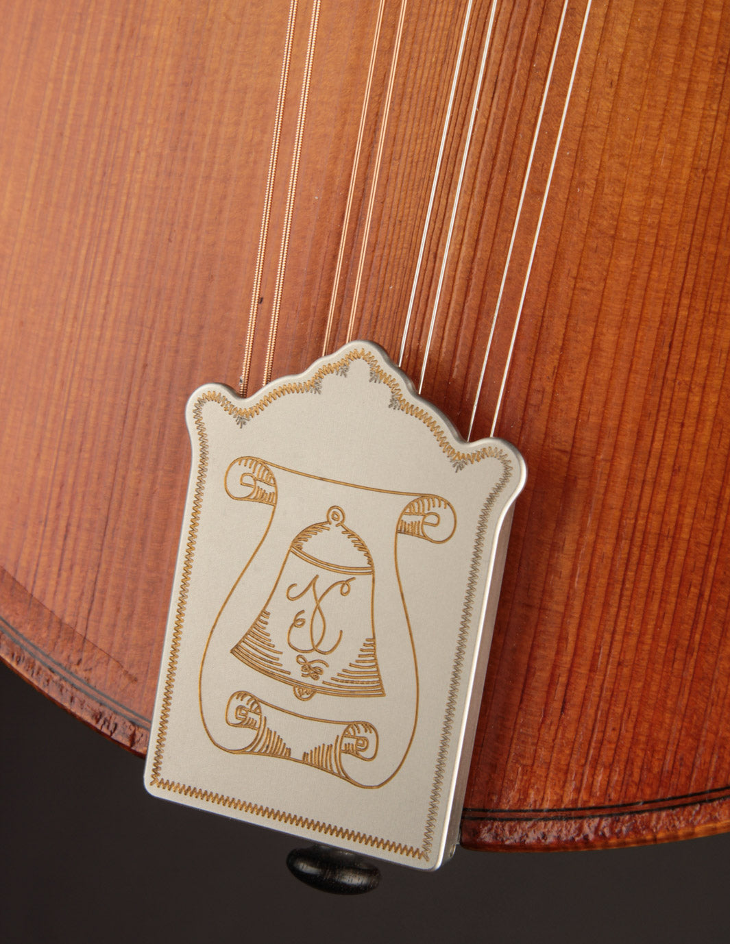 Aided by its European spruce top and tone bar bracing, this Campanella A style has some serious pop, focus and power. Appointments include a James tailpiece, Grover tuners, Campanella's signature bell headstock inlay in abalone, and an ebony pickguard.