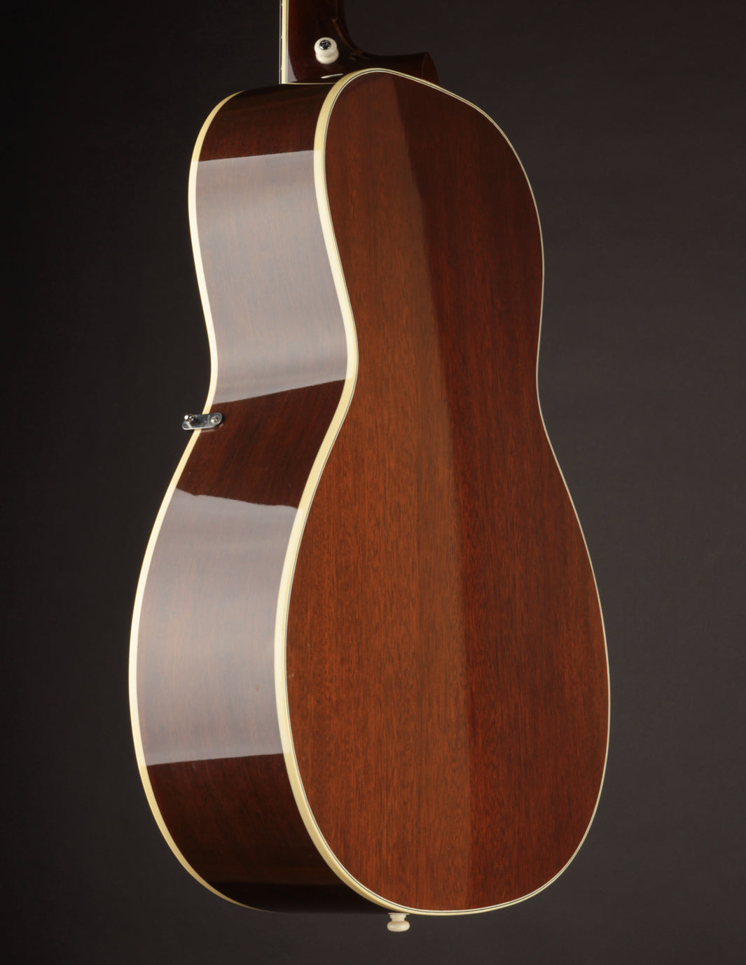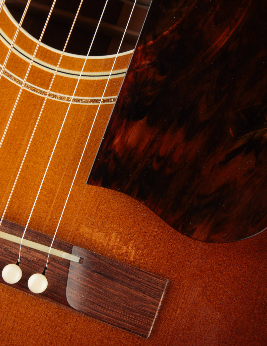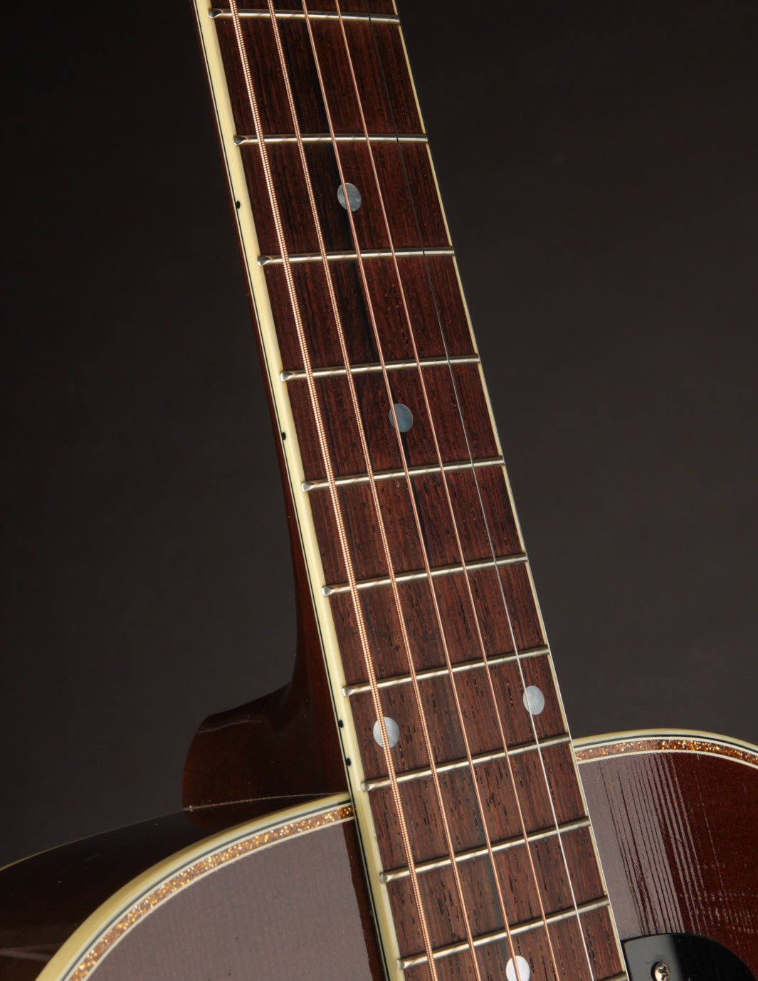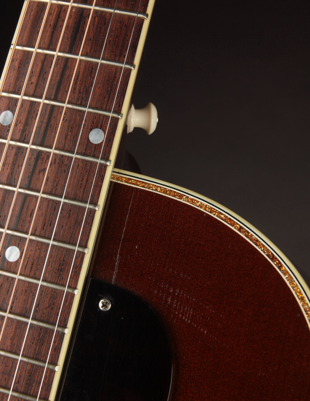 The guitar remains in very good overall condition. It's been gigged, so expect to see a couple small dings and errant pick marks on the sound board. There's a small crack near the treble side of the fingerboard tongue -- a byproduct of the optional screwed-in pickguard's installation. The crack was repaired years ago by Dale Fairbanks, and remains stable at this time. Our shop has freshened the setup and given it a clean bill of health. Priced with its original TKL hard case.