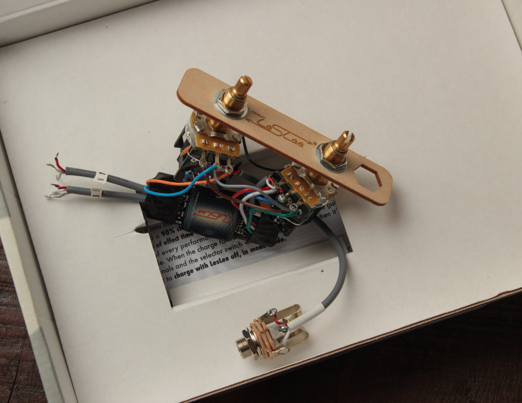 The Pickup LesLee is a cool little piece of analog onboard technology that utilizes your bridge and neck pickups to generate a distinct percussive tremo-vibe sound simply by auto-alternating the pickup signals!