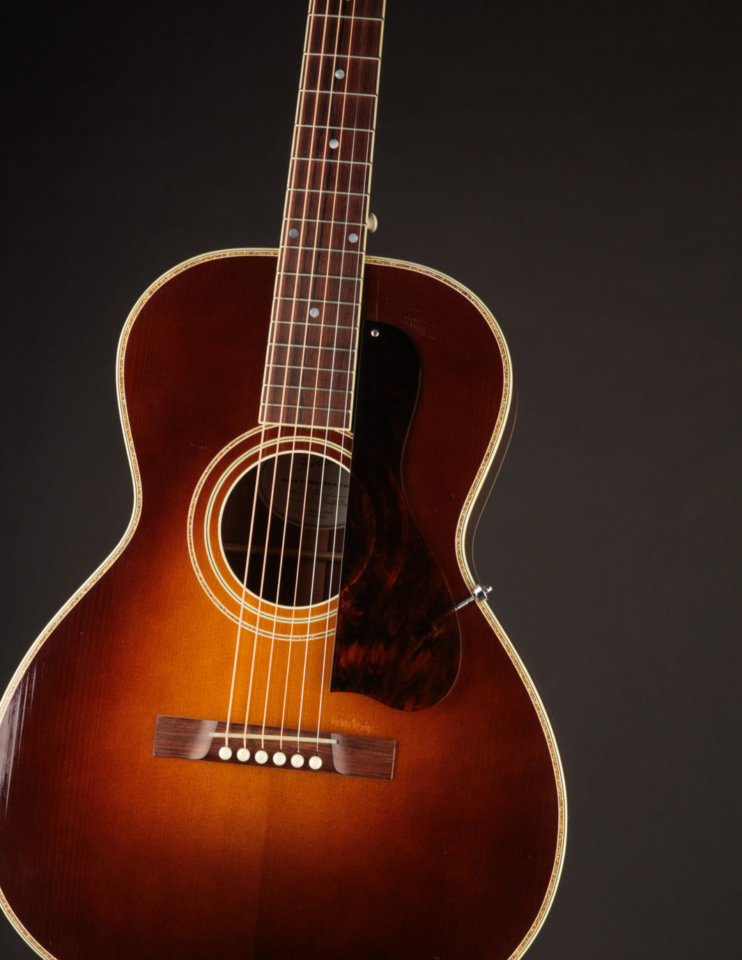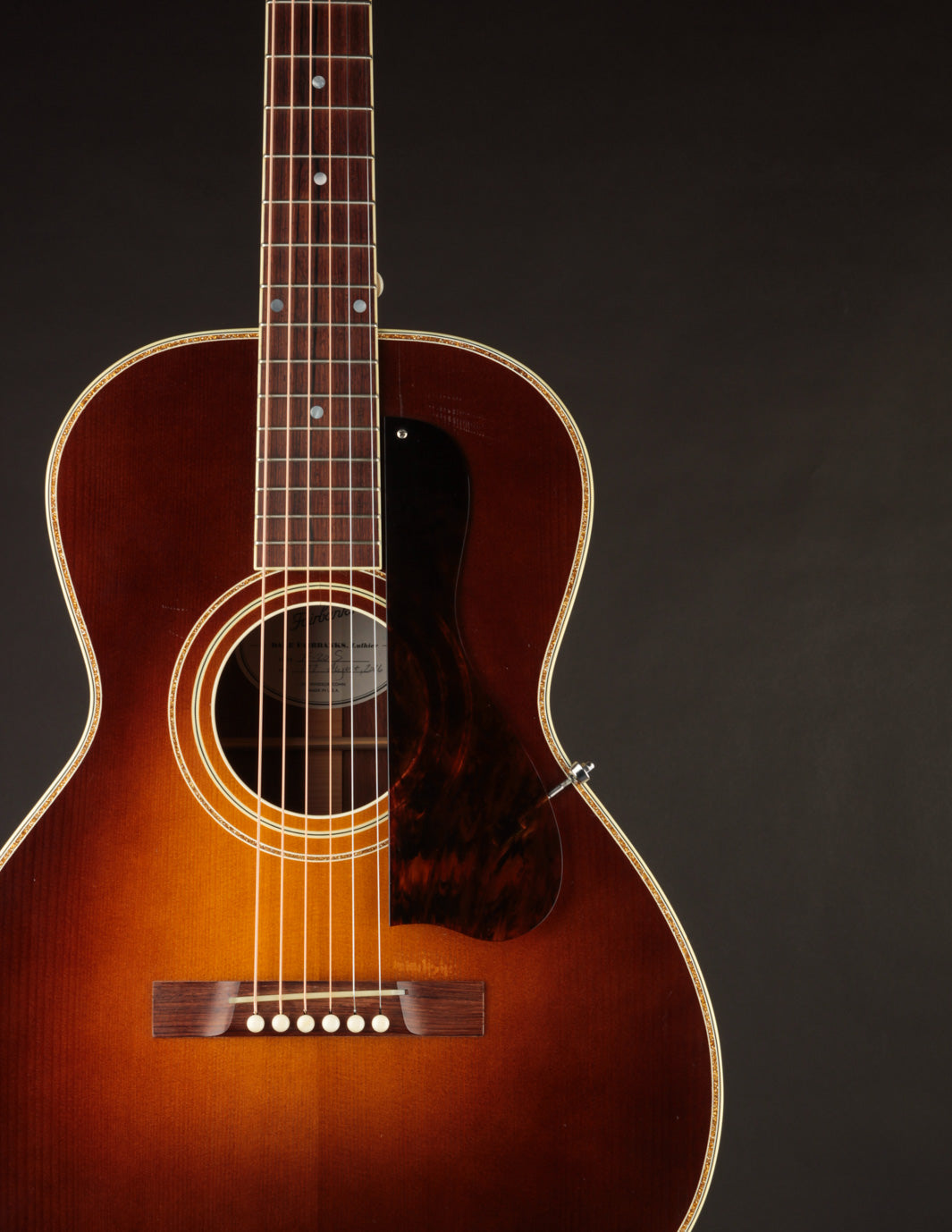 The guitar remains in very good overall condition. It's been gigged, so expect to see a couple small dings and errant pick marks on the sound board. There's a small crack near the treble side of the fingerboard tongue -- a byproduct of the optional screwed-in pickguard's installation. The crack was repaired years ago by Dale Fairbanks, and remains stable at this time. Our shop has freshened the setup and given it a clean bill of health. Priced with its original TKL hard case.