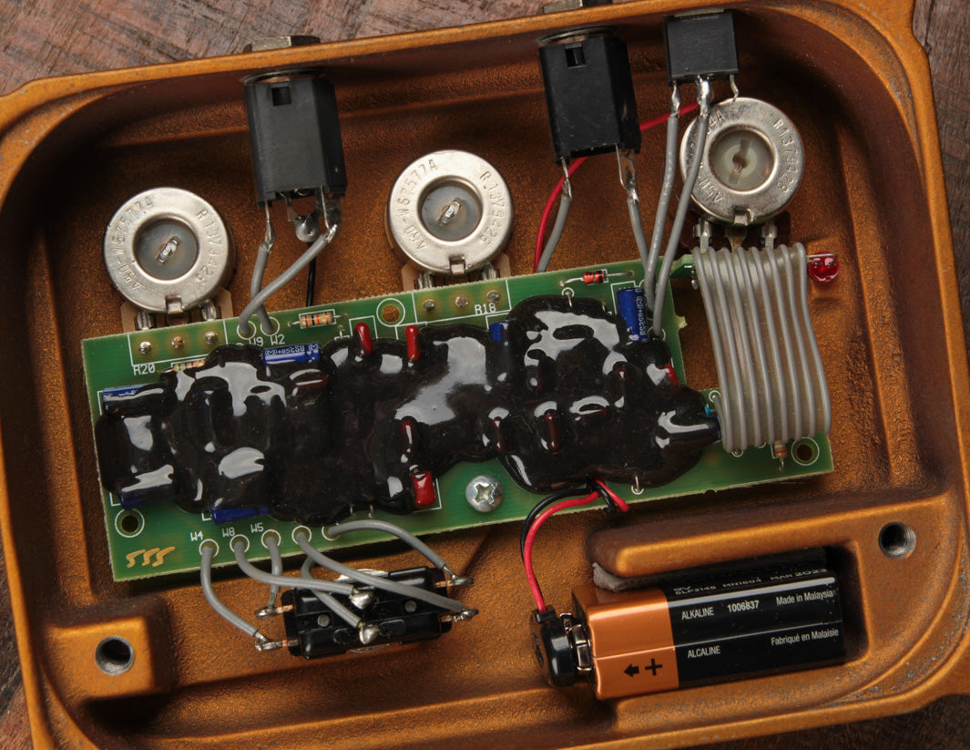 Beyond the minor change in artwork, this is an original and unmodified circuit, complete with all of the epoxy-coated components. While used throughout the years, it was very well cared for, with just some superficial signs of wear on the enclosure. Rubber feet were once installed and then removed from the back plate.