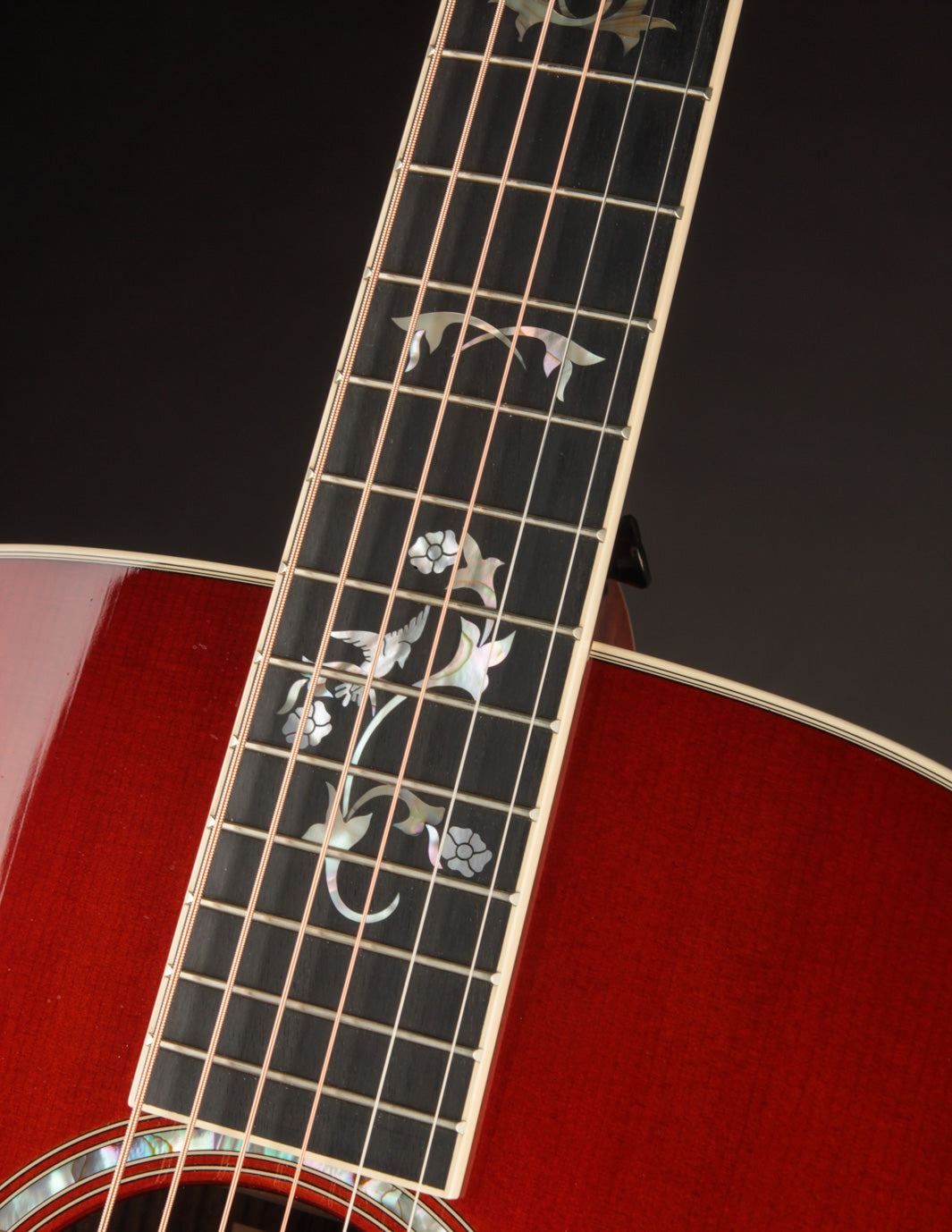 This Taylor Legacy 810E's beautiful Heritage Sunburst finish and unique segmented vine-style inlays have us thinking of the dawn of the boutique flattop era.